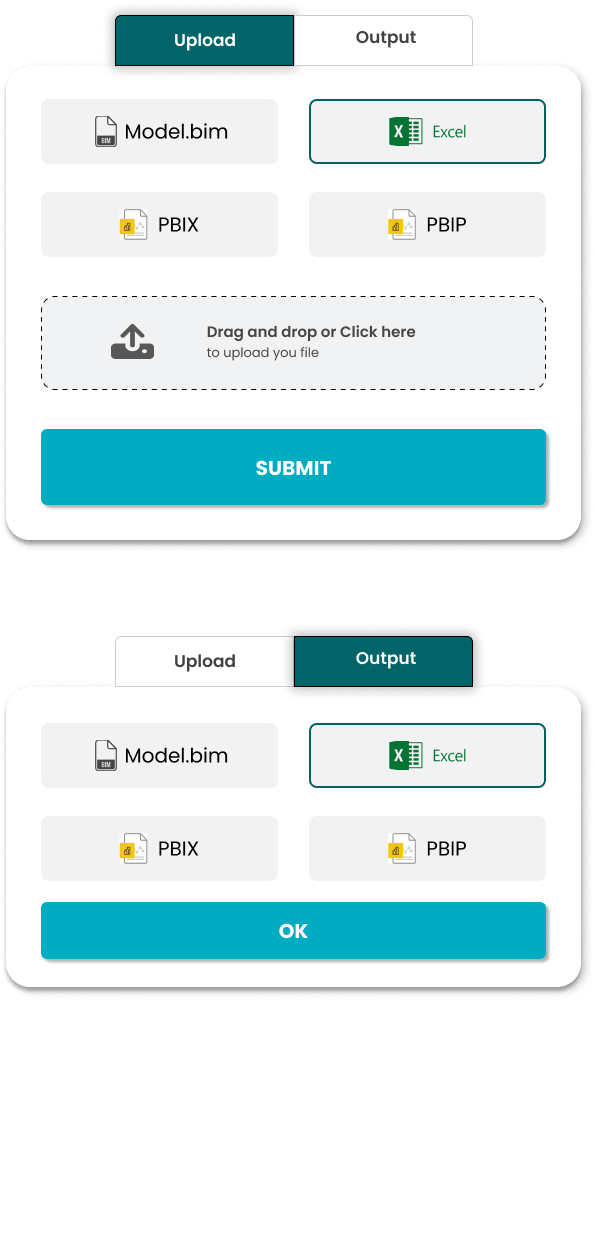 - Model.bim - Directly upload your Model.bim files to optimize complex data models without extra conversions.